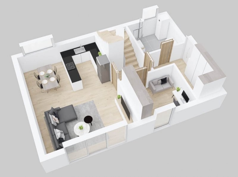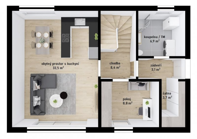Patrová dřevostavba má půdorys ve tvaru obdélníku o rozměrech 7,38 x 10,68 m. Interiér má promyšlené dispoziční rozdělení domu na společenskou a klidovou. Nevyhovujeme vám půdorysné řešení? Upravíme celý dům podle vašeho přání.