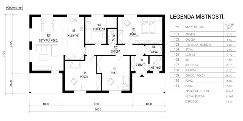 Bungalov SWING 116 je perfektní řešení přízemního rodinného domu pro užší pozemek. Zastavěná plocha, která se odehrává na 161 m2, nabízí prostorných 116 m2 o celkové dispozici 4+kk. Obývací pokoj, který je propojen s kuchyní a jídelním koutem, tvoří pravé centrum denní části. Soukromí a klidová zóna vhodná až pro pětičlennou rodinu je pak zajištěna dvěma pokoji a jednou ložnici o velikostech 15,9 m2 ,15,5 m2 a 17,7 m2. V domě nechybí ani prostorná technická místnost či šatna.