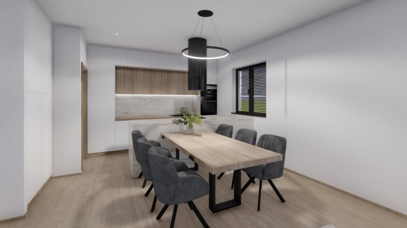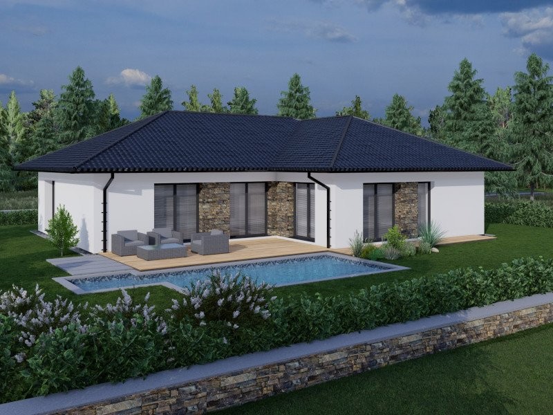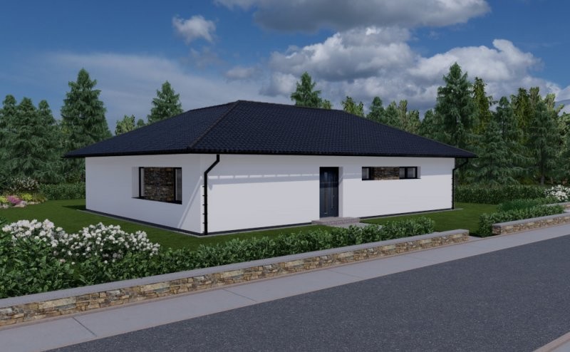 Bungalov SWING 125 patří mezi oblíbené nízkoenergetické rodinné domy nejenom díky své dispozici 5+kk, ale také díky užitnému prostoru 125,2 m2, který se odehrává na 149,7 m2 zastavěné plochy. Denní zóna tvořena prostorným obývacím pokojem, jídelnou a kuchyní představuje pravé srdce dřevostavby. Soukromí a klid až pětičlenné rodiny zaručují dva pokoje o velikosti 11,6 m2 a jedna ložnice o velikosti 13,7 m2. V domě nechybí ani pracovna či technická místnost.