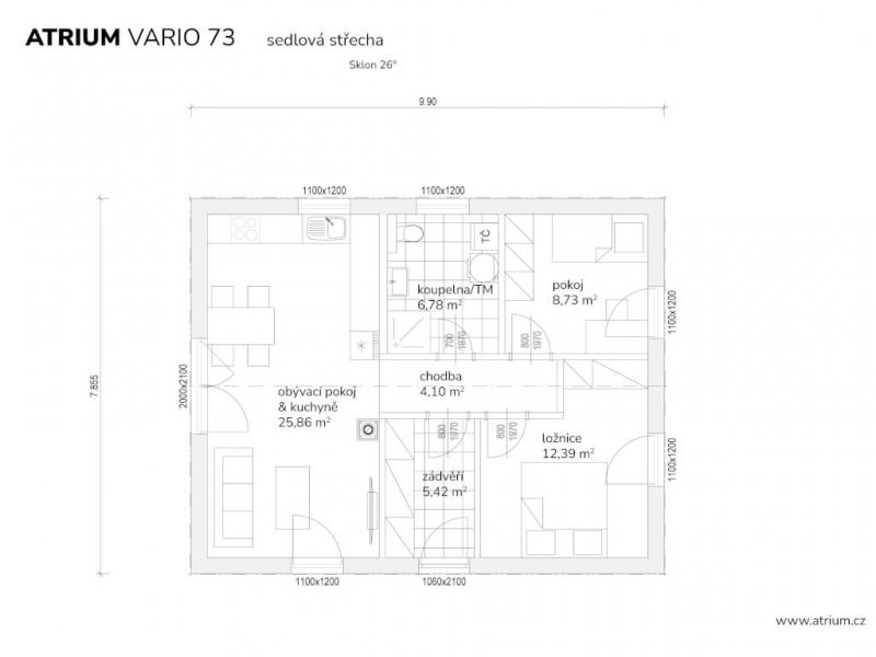 Vario 63 je dům vhodný pro menší rodinu či pro seniorský pár. Jeho dispozice je možné upravit dle přání klientů, v tomto provedení nabízí prostorný obývací pokoj s kuchyňským koutem a dvě místnosti, z nichž jedna může sloužit jako pokoj pro hosty nebo jako pracovna. Dům je možné realizovat i jako bezbariérový. Majitelé ocení tepelné čerpadlo a krbová kamna, oboje je v ceně na klíč.