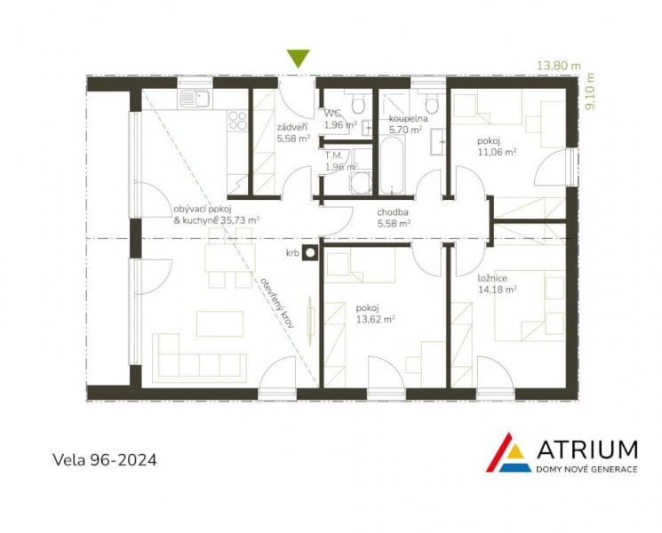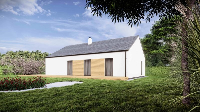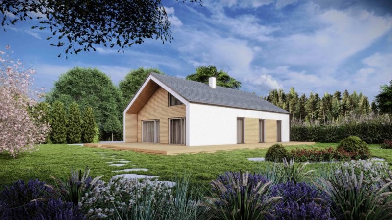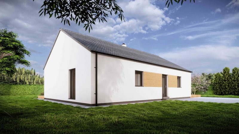 Posunuli jsme laťku moderního bydlení o něco výše. Představujeme nový typový přízemní dům s 96 m2 užitné plochy. Dřevostavba otevřená do krovu je populární konstrukční technikou, která kombinuje tradiční vzhled s moderními designovými prvky a praktickými výhodami. Díky otevřenému charakteru stěn lze interiér domu propojit s okolní přírodou a získat tak příjemný a vzdušný prostor. Vnitřní dispozici tvoří tři ložnice, prosvětlený obývací pokoj a moderní kuchyně ve tvaru L. Atraktivním prvkem je částečně prosklený štít s výhledem do zahrady.