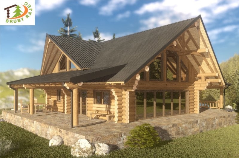 Luxusní dvojpodlažní srub s prosklenými štíty, galerií a krytými terasami.