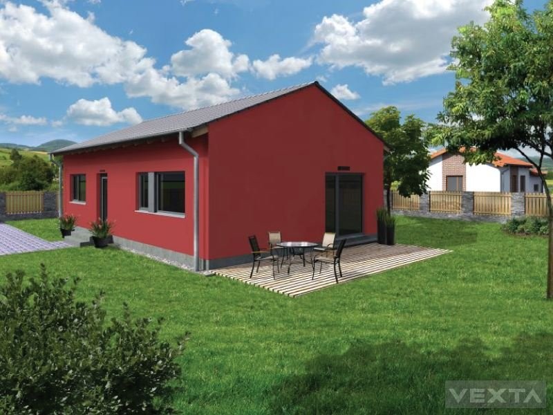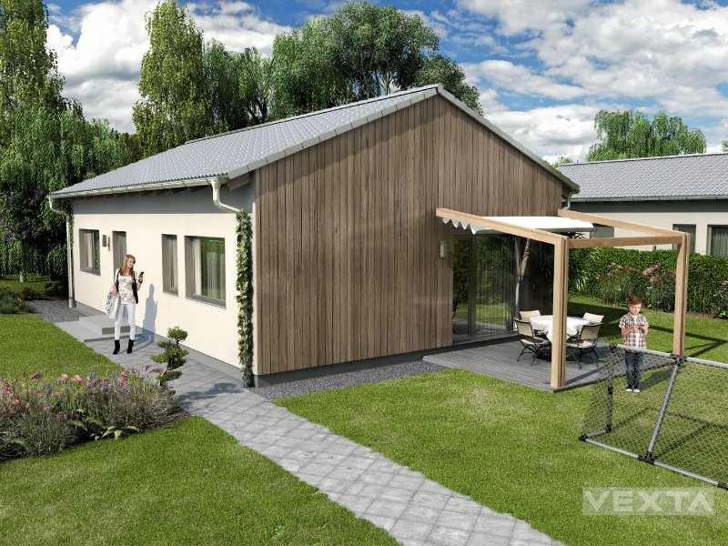 Moderní přízemní bungalov 4+kk, optimálních rozměrů (podlahová plocha 75,1m2), který bez problémů umožní bydlení i vícečlenné rodině. Do této dřevostavby na klíč se vchází přes zádveří. Přímo proti vstupu je vchod do chodby, ze které se dostanete do obývacího pokoje s kuchyňským koutem, koupelny, samostatného WC a dvou pokojů, které snadno z dětské ložnice proměníte na pracovnu, šatnu či hostinský pokoj. Z obývacího pokoje je přístupná ložnice, která může fungovat jako ložnice rodičů. Prosklené francouzské okno v obývacím pokoji umožňuje přímé propojení interiéru s exteriérem, tedy obývací místnosti se zahradou. Není lepší bydlet v takovém domě, než bytě?