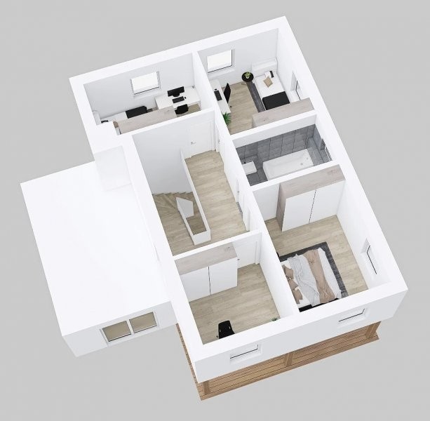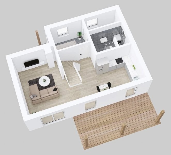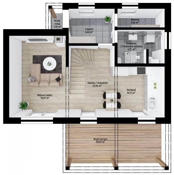 Moderní patrový dům Vita 1-112 nabízí bydlení s funkčně navrženou vnitřní dispozicí a dostatkem úložných prostor. Na celkové ploše 112 m2 nabízí tři prostorné samostatné pokoje, studio a koupelnu v podkroví. V přízemí obývací pokoj, jídelnu s kuchyní, dále halu, koupelnu s WC a také komoru. Z kuchyně a jídelny je snadný přístup na krytou terasu, která obytný prostor ještě zvětšuje.