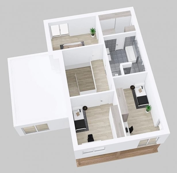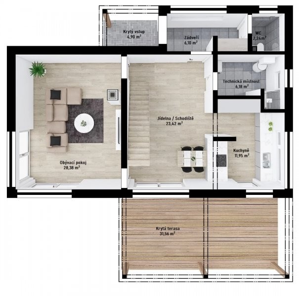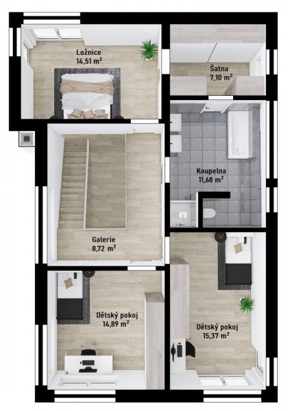 Prakticky celé přízemí patrového domu Vita 3-151 zabírá obrovský společný obývací prostor s jídelnou a kuchyní, odkuj je navíc přímý vstup na krytou terasu, která celý prostor ještě více rozšiřuje. Z galerie v patře pak vstoupíte do 3 pokojů a koupelny, která je přes šatnu navíc propojena s jednou z ložnic.