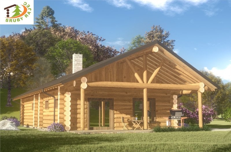 Přízemní srub větší velikosti k využití k trvalému bydlení pro 4-člennou rodinu. Prodloužená střecha na štítové stěně vytváří příjemnou krytou terasu s výstupem z obývacího pokoje.