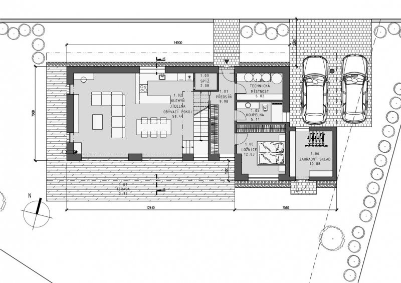 Při zpracování architektonické studie byl kladen důraz na co nejefektivnější využití prostoru a zamezení vzniku zbytečných chodeb. Předsíň plynule přechází v chodbu, která příčně protíná celý objekt. Z chodby je umožněn vstup do technické místnosti, koupelny, ložnice a obývacího pokoje s kuchyní a jídelnou.