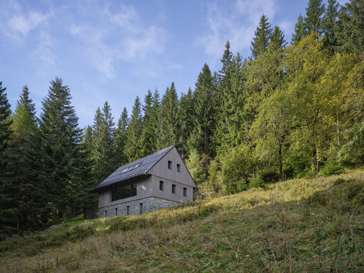 V rámci metodiky Krkonošského národního parku musel návrh respektovat řadu konkrétních požadavků: typ a sklon střechy včetně konstrukce krovu, orientaci hřebene, materiálové i barevné řešení pláště i velikost a rozmístění oken v tradičně pojatých štítech. „Současný výraz se promítl zejména do práce s podélnými fasádami, kde bylo možné použít velkoformátové prosklení, a do detailu – zapuštění oken, materiálové řešení či odlišný odstín dřevěného obkladu,“ dodává.