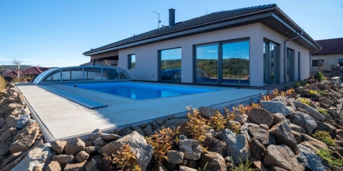 Naše původní představa byla dost odlišná od architektem navržené a jsem rád, že nás přesvědčil o některých změnách. Hodně oceňujeme výšku stropu tři metry v hlavním obytném prostoru. Celkově místnost působí o dost vzdušnějším dojmem. Prostor podle mého také pozvedá velký mechový obraz 2,5 × 1,5 metru, který jsem chtěl od začátku. Skvělou věcí jsou velké prosklené plochy z chodby a obýváku směrem k bazénu. Jako výrobce bazénů jsem považoval za důležité, aby byl perfektně viditelný pro všechny příchozí. V létě se návštěvy většinou odehrávají rovnou na obrovské terase u bazénu nebo v altánu u zahradního domku.