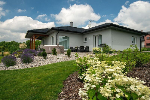 Náš bungalov částečně vychází z typového domu s tím, že jsme si nechali dispozičně upravit velikost jednotlivých pokojů a prodloužit přesahy, které jsou praktické a perfektně nám chrání terasu. V interiéru jsme chtěli zachovat vzdušný prostor s vysokým stropem, otevřeným z přízemí až po hřeben střechy, který nás při prohlídce vzorového domu doslova očaroval. Na zahradě jsme nechali zbudovat zahradní domek, u kterého máme navíc i vinný sklípek s posezením.