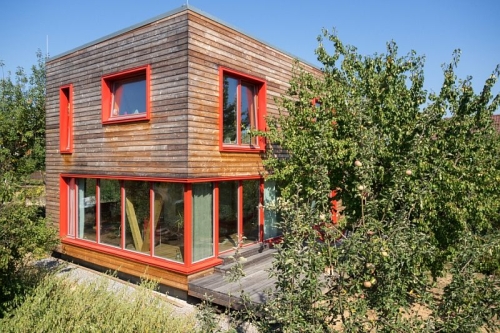 „Na přesah střechy jsem zvláště pyšný. Přirozeně chrání zavěšenou modřínovou fasádu před přímým sluncem a deštěm, což mnohonásobně prodlužuje jak její estetickou, tak faktickou životnost. Hlavním významem však je přirozená ochrana velkých okenních ploch před přímým slunečním svitem, které by jinak mělo za následek fatální přehřívání domu.