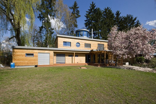 Rozhodli jsme se stavět v té odlehlejší a pro stavbu nekultivované části pozemku, což vyžadovalo rozsáhlé terénní úpravy a velkou opěrnou zeď, která byla finančně hodně náročná. Protože se ve své profesi denně setkávám se dřevem, mám k němu silný vztah. Dřevostavby znám dlouhá léta, obdivuji jejich technickou preciznost a „přirozené" energetické standardy bez nutnosti tlustých stěn. O technologii jsme tedy nepřemýšleli ani na okamžik.
