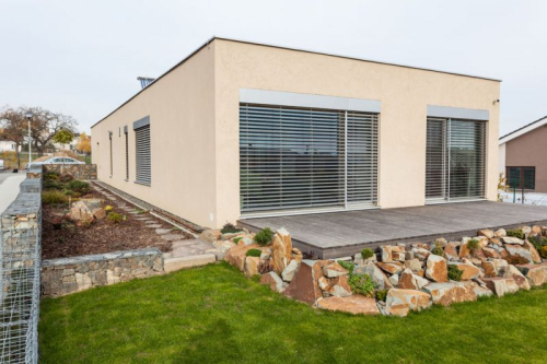 obr.: Dům využívají Jindřich s Lenkou zatím jen jako víkendový, je třeba jej vhodně zabezpečit na dobu, kdy zůstává prázdný. Praktické předokenní clony v kovovém rámu uzavřou všechny velké prosklené plochy a navíc jsou uzamykatelné. Foto: Martin Zeman
