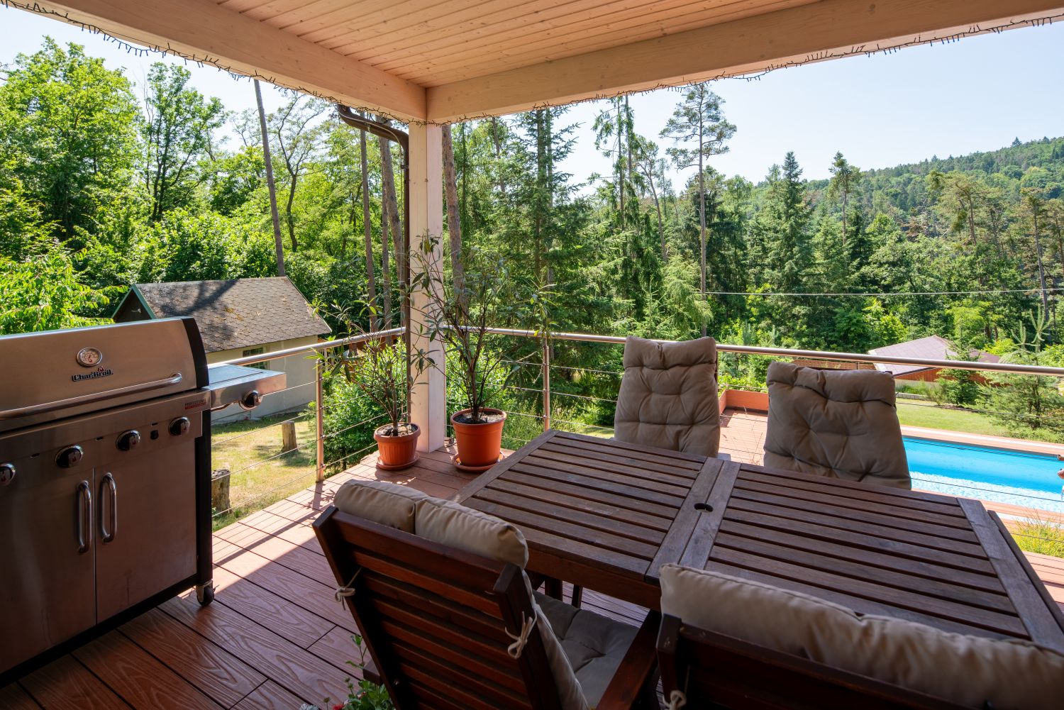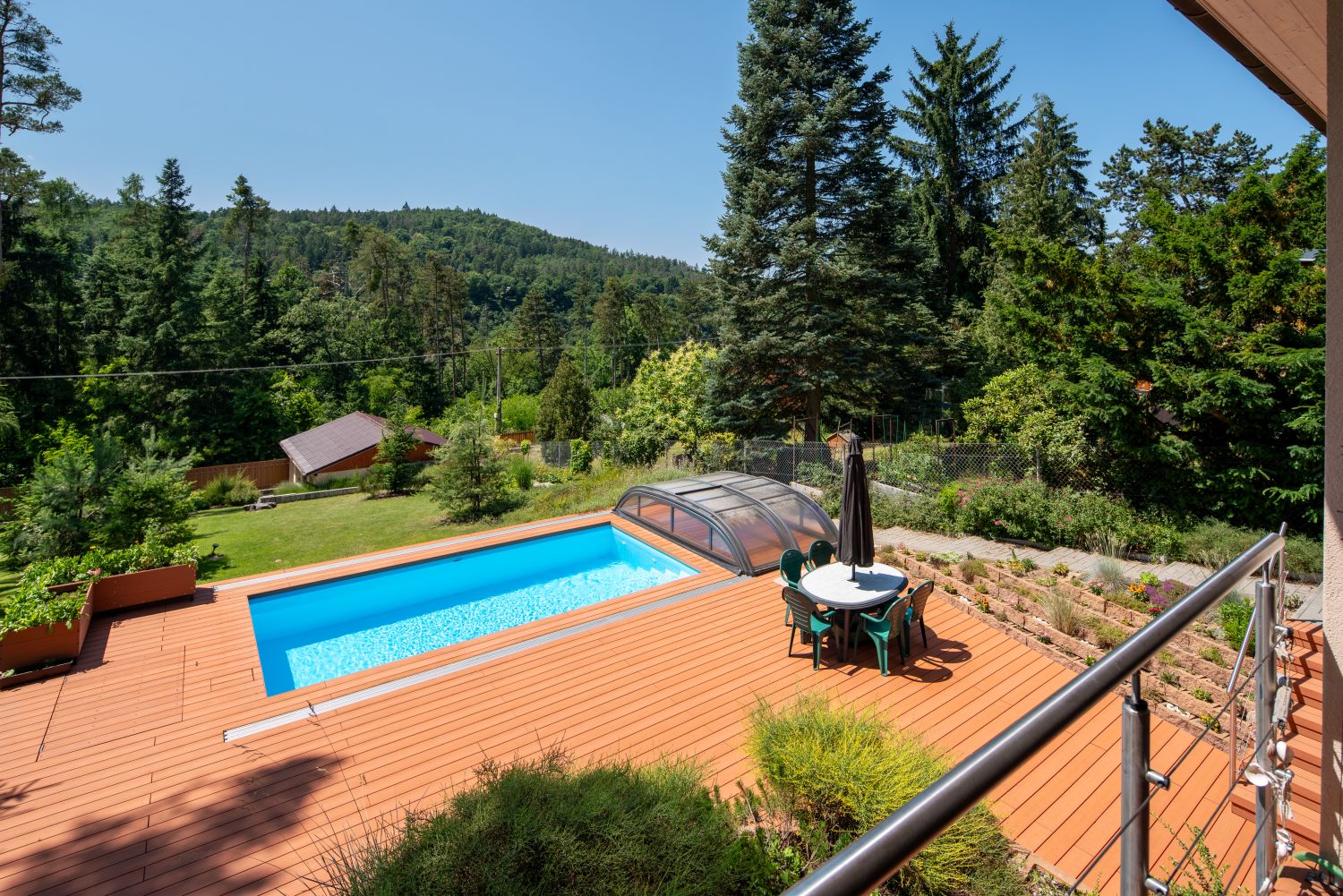 Výhled: Bazén, podobně jako terasa, těží z krásného výhledu na okolní lesy. Několik zachovaných stromů je tichou připomínkou původního zalesněného charakteru parcely. Foto: Martin Zeman