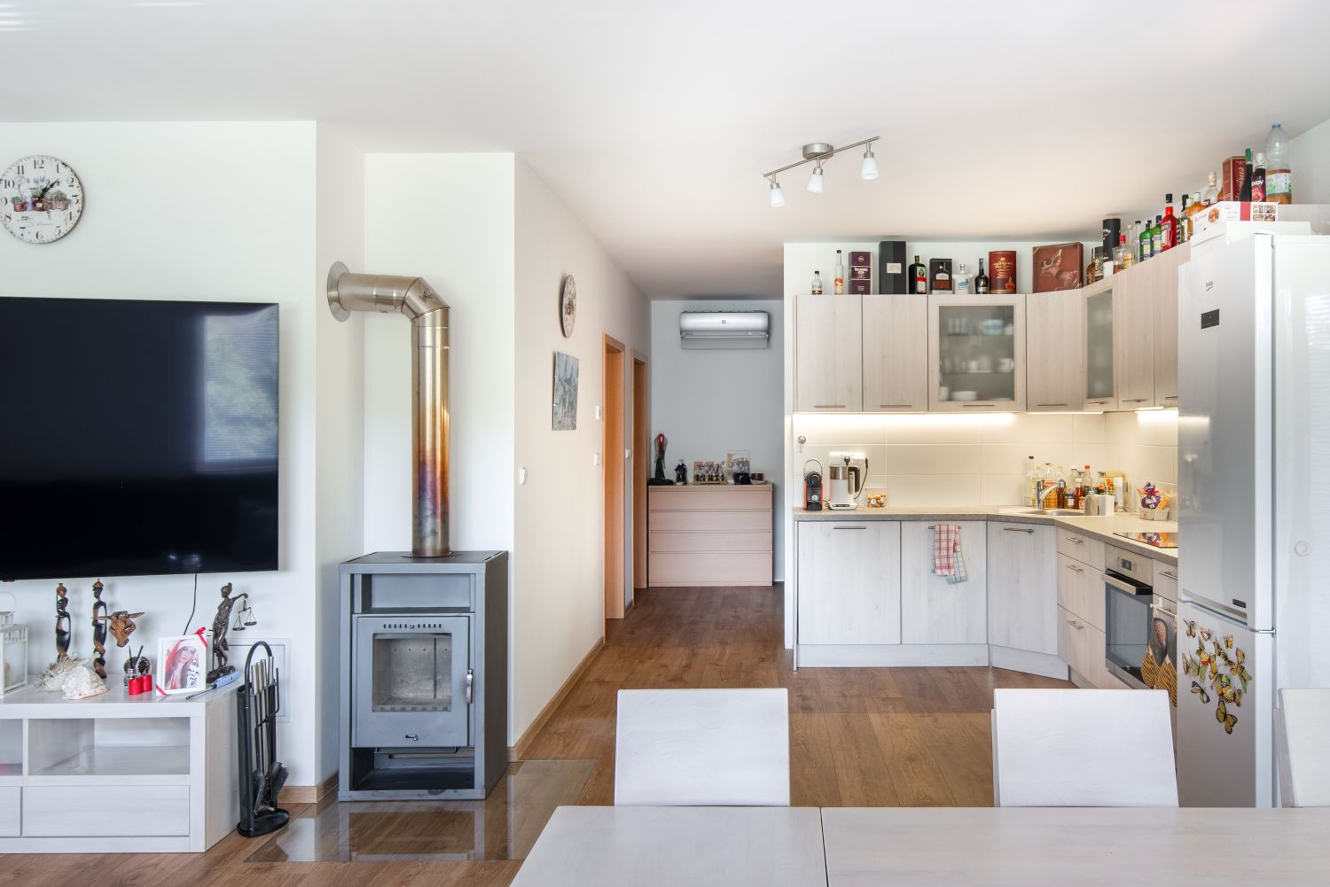 Časem vyvstal problém absence systémového vytápění – dům původně neměl být obývaný celoročně, a proto jsem s ním v projektu jednoduše nepočítal. Uvnitř je sice nainstalováno několik elektrických přímotopů, ale tato varianta vytápění se mi pro dlouhodobý provoz nezdála vhodná. Nakonec se to povedlo vyřešit elegantně, na přechodná období slouží krbová kamna ve společných prostorách a tepelný komfort po celý rok zajišťuje dodatečně nainstalované tepelné čerpadlo vzduch-vzduch. Funguje to pěkně – je tu teplo i během chladných dní a plískanic.