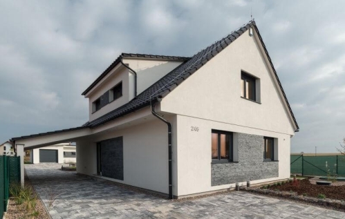 obr.: V místě hlavního vstupu do domu je praktické kryté stání pro auto. K příjezdové komunikaci je dům otočen severní fasádou s menšími okny, ta chrání soukromí a zabraňují zbytečným ztrátám tepla. Foto: Martin Zeman