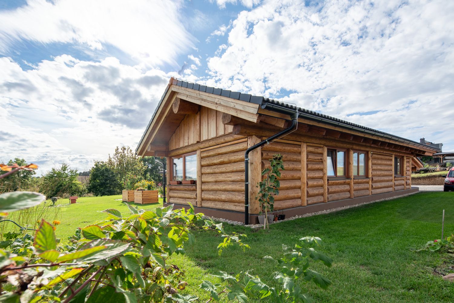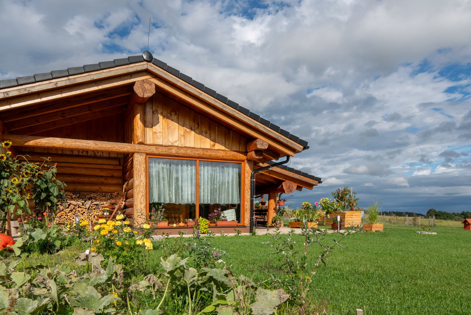 obr.: Ačkoliv okolí srubu ještě není úplně dokončené, zeleň zahrady majitelům poskytuje příjemné propojení s přírodou a zahrnuje i první zeleninovou úrodu. Do budoucna však plánují okolo zahrady postavit plot. „Protože jsme na kraji, stávalo se nám přes léto, že nám přes pozemek chodili úplně cizí lidé,“ vysvětluje Danča. Foto: Martin Zeman