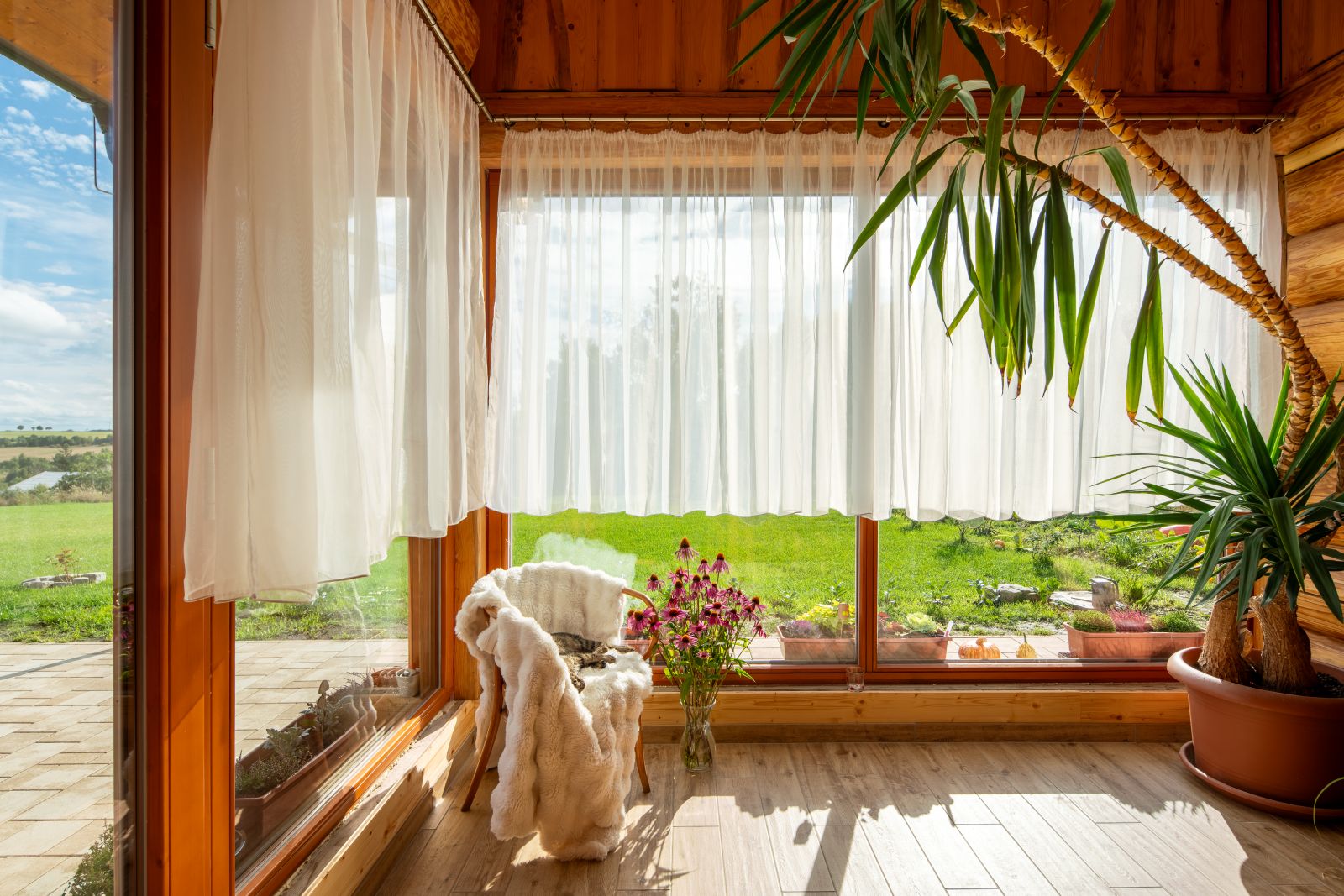 obr.: Zimní zahrada byla jedním z Dančiných požadavků ohledně dispozice. „Přes léto mám většinu rostlin venku a dovnitř je přesouvám, když se ochladí,“ popisuje. „Celoročně tu zůstává jen palma, která musí být kvůli velikosti přivázaná ke stropu.“ Foto: Martin Zeman