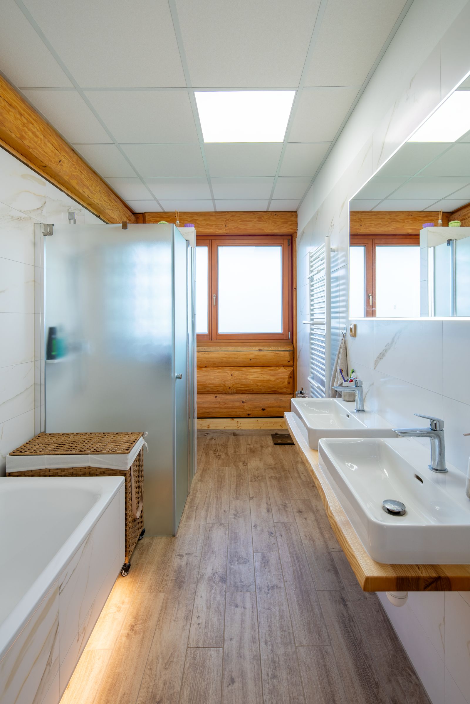 obr.: Hlavní koupelna je asi jediným místem, kde se oproti původnímu projektu výrazněji zasahovalo – vana byla přesunuta od okna ke vstupu a k oknu byla naopak umístěna toaleta. Druhá koupelna se nachází u hlavních dveří a slouží buď pro každodenní potřebu, nebo jako zázemí pro návštěvy. Foto: Martin Zeman