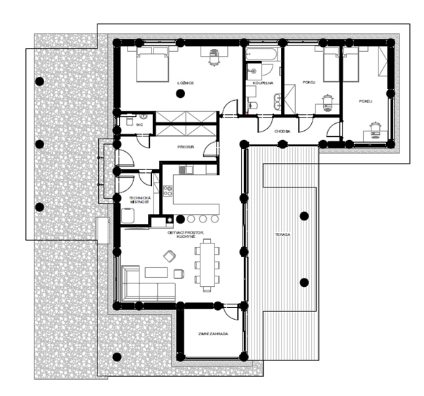 - Zdroj energie / teplo: tepelné čerpadlo země-voda, krbová vložka