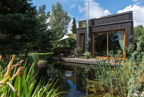 - Za pozornost stojí čistička – chtěli jsme původně recyklační uzavřený okruh, ale pak jsme se rozhodli pro dvoustupňové čištění. Voda tak jde do vsaku a zůstává všechna na pozemku – využíváme ji na zálivku.