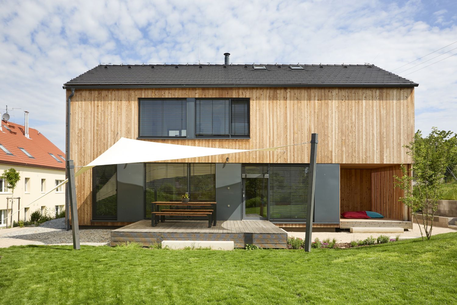 „Máme navíc zastřešenou schovanou terasu, kterou velmi často využíváme a je pro nás přidanou hodnotou začlenění architekta do procesu. Je intimní, v létě poskytuje stín, děti si tam hrají, i když drobně prší... Je to pro nás velký benefit spojující dům s venkovním prostorem."