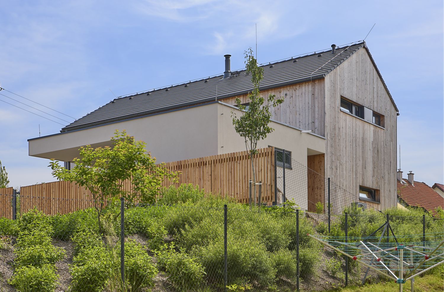 Svažitý: Dům bylo třeba citlivě umístit ve výrazném svahu. Výsledkem je klasický obdélníkový půdorys se sedlovou střechou o sklonu 30° s černými betonovými taškami Bramac Tegalit, k němuž přiléhá kryté parkovací stání spolu s menším skladem. Konstrukce je založena na základových pasech se základovou deskou a modřínová fasáda bez povrchové úpravy bude postupně přirozeně šednout. Foto: LINA NÉMETH