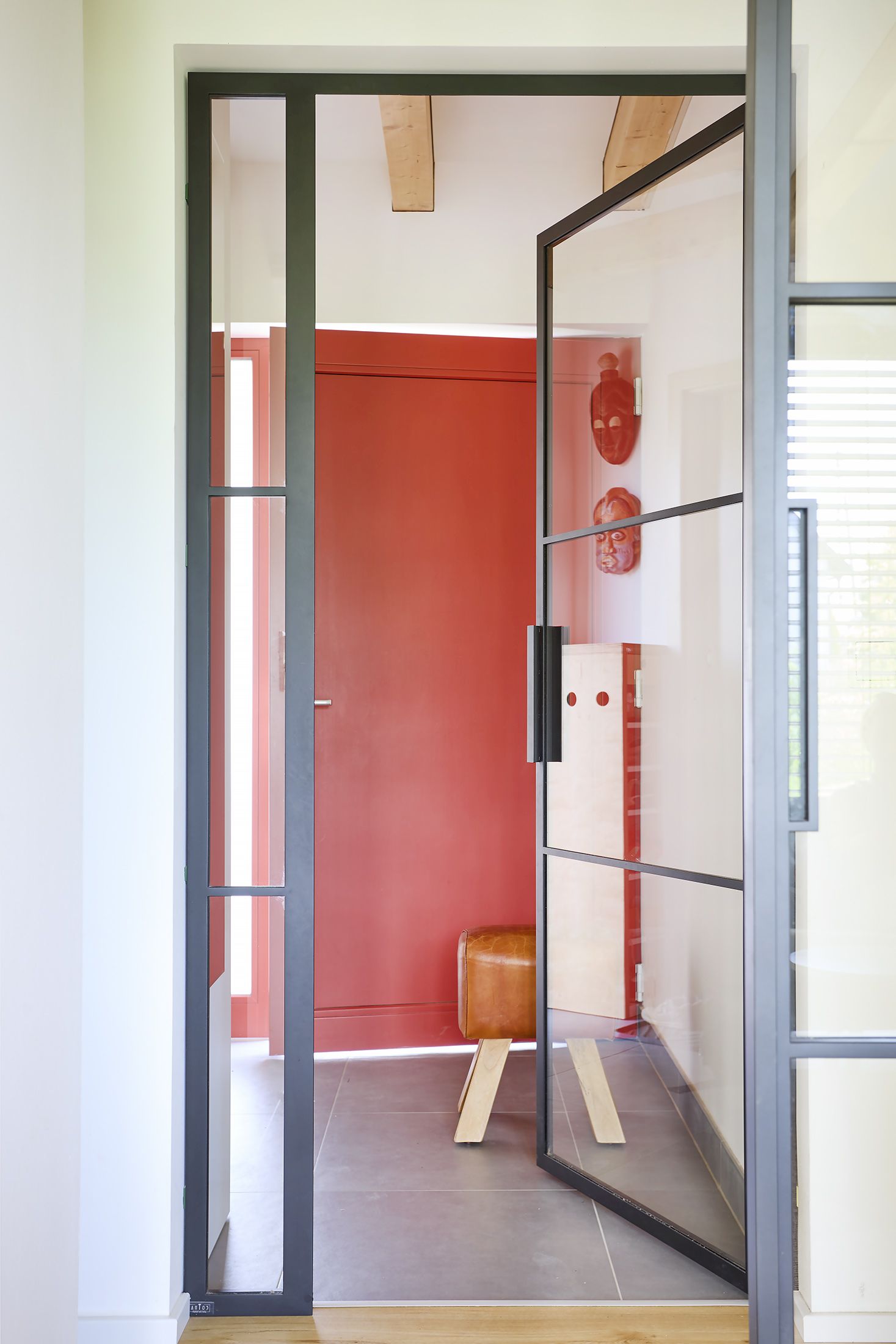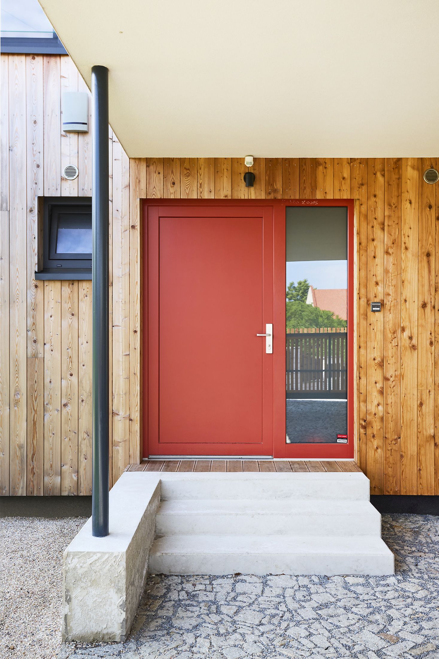 Akcentní: Spojením dvou hmot zároveň vznikl chráněný vstup do domu, jemuž dominují červené dveře – jedna z připomínek holandské architektury a výsledek souladu mezi klienty a architektem. Foto: LINA NÉMETH