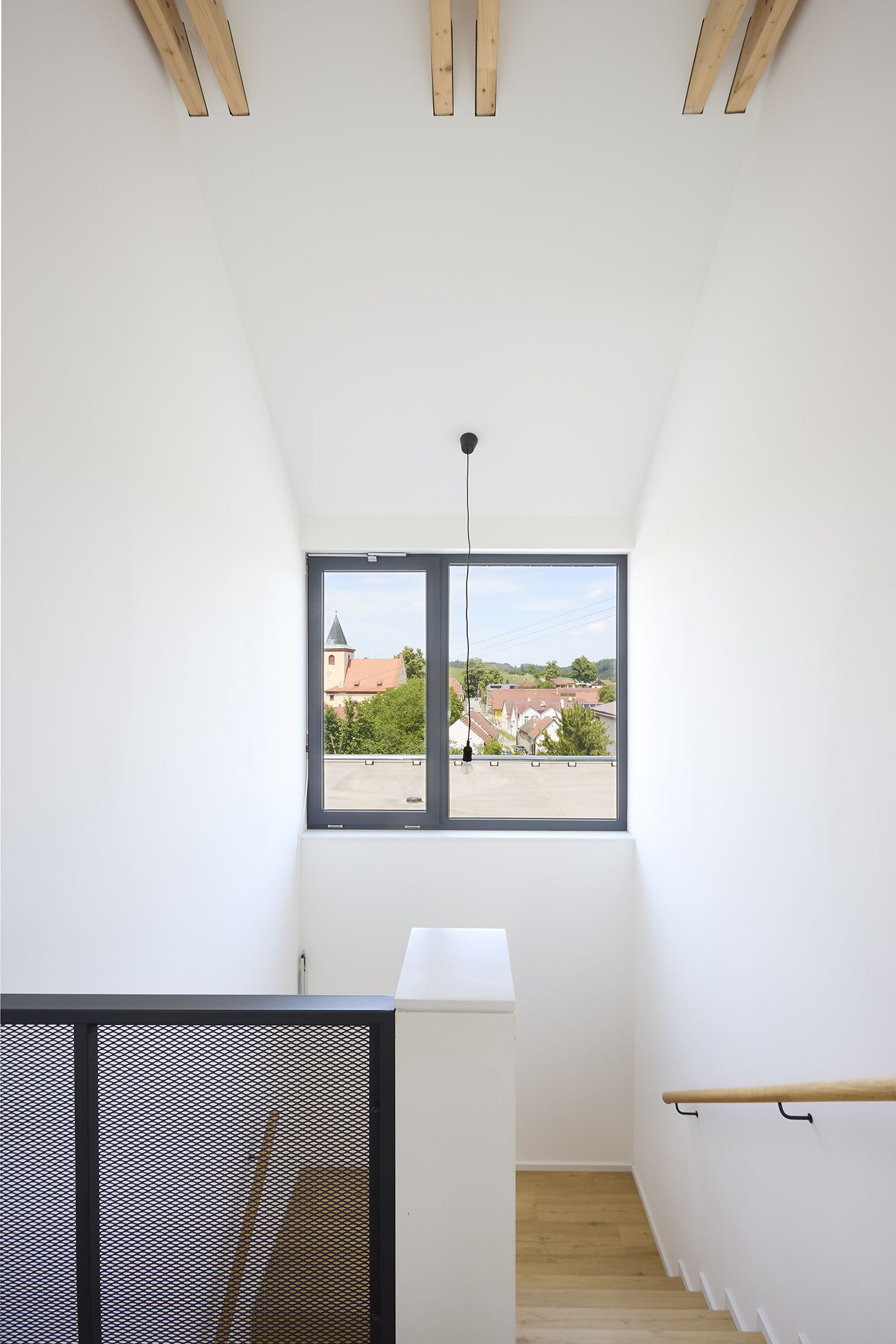 Interiér si klienti přáli útulný a vzdušný s industriálními prvky, který v sobě má hravost – aby bylo možné s ohledem na aktuální životní situaci jednoduše změnit účel určitého prvku. V jídelní části tak „sedací" výklenek zatím slouží jako dětský koutek a nad jídelním stolem je loftový prvek ve formě průhledu na horní galerii. Zajímavý kontrast ke světlému dřevu a bílé výmalbě tvoří černé prvky – lakované prosklené dveře z předsíně či výklenky kolem komína na patře využívané jako knihovna.
