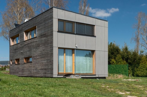 Aby investoři nemuseli znovu absolvovat náročné stavební řízení, vycházeli architekti z půdorysu původního návrhu. Využili kombinace čistých linií, jednoduchých tvarů a přírodních materiálů. Hlavní hmota dvoupodlažního kvádru s bílou fasádou je jemně členěna velkorysými prosklenými plochami modřínových oken. Obytnou část vkusně doplňuje dílna se skladem a garážové stání.
