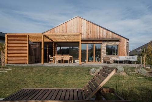 - Fasáda: příčlové přítlačné dřevěné rámy + pozink. lakovaný plech, na terase palubka P+D, vzdušné příčlové panely a síťové zábradlí