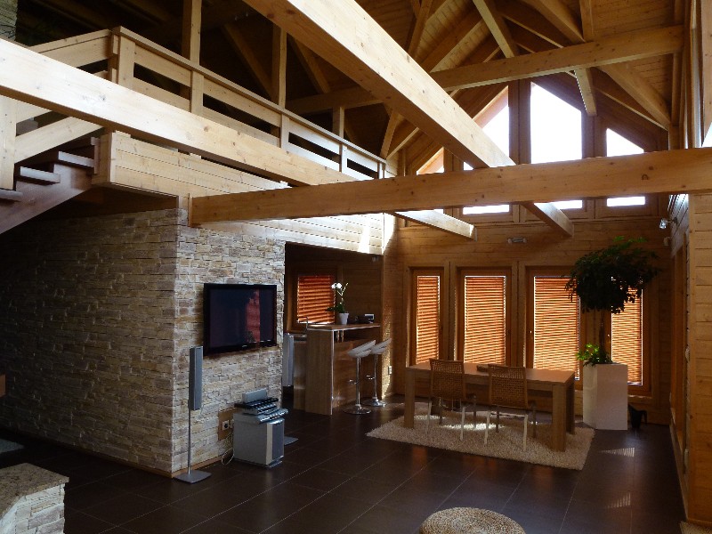 V interiéru zůstává dřevo v pohledové kvalitě a velmi pěkně vypadá, jako v tomto případě, v kombinaci s kamenem. Atraktivním prvkem tohoto domu je kromě stylově čistého vybavení také průhled z galerie v prvním patře nad obývacím pokojem.
